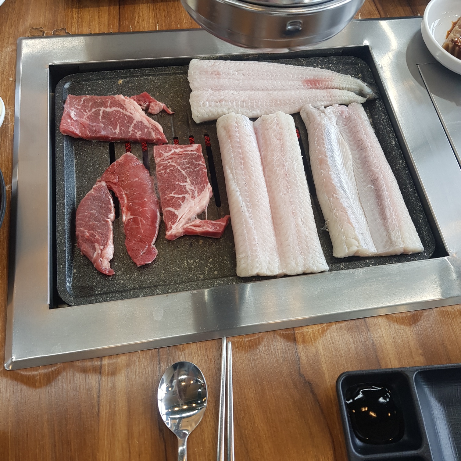 장어를 못 먹는 아이들을 위해 삼겹살과 소고기, 오리고기도 있습니다.